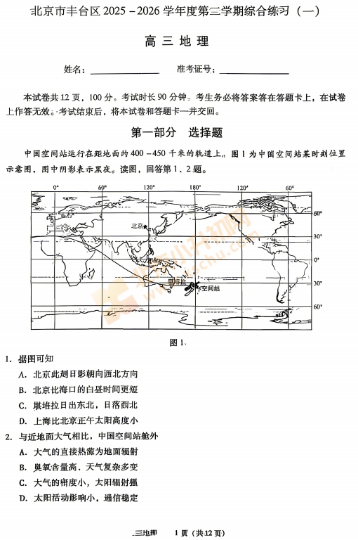 2026丰台高三一模地理试卷已出!考哪些内容?满分多少?有多少题?2026、2027、2028丰台高三考生下载复习!