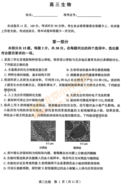 2026丰台高三一模生物试卷已出!考哪些内容?满分多少?有多少题?2026、2027、2028丰台高三考生下载复习!