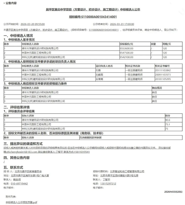 北京市公共资源交易服务平台发布昌平区奥北中学项目(方案设计、初步设计、施工图设计)中标候选人公示。