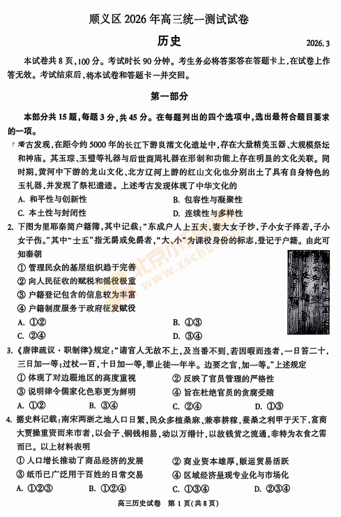 2026北京顺义高三一模历史 有答案