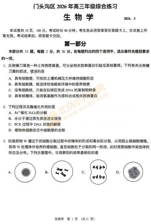 2026门头沟高三一模生物试卷已出炉!北京小升初网汇总整理2026年北京各区高三一模试卷,点击图片打包下载,或文末下载PDF文件!