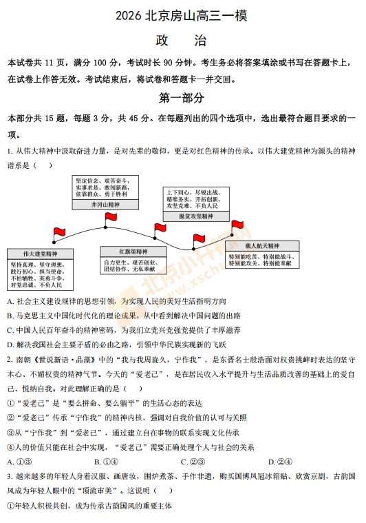 2026房山高三一模政治试卷已出!考哪些内容?满分多少?有多少题?2026、2027、2028房山高三考生下载复习!