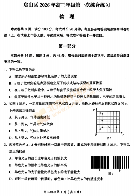 2026房山高三一模物理试卷已出!考哪些内容?满分多少?有多少题?2026、2027、2028房山高三考生下载复习!