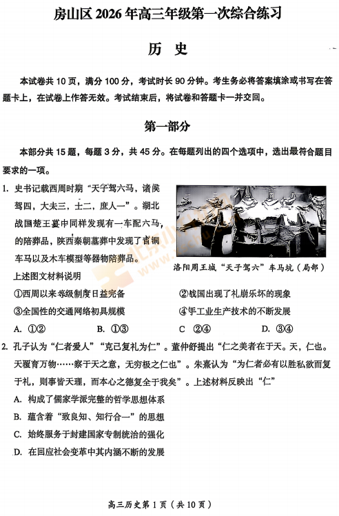 2026房山高三一模历史试卷已出!考哪些内容?满分多少?有多少题?2026、2027、2028房山高三考生下载复习!