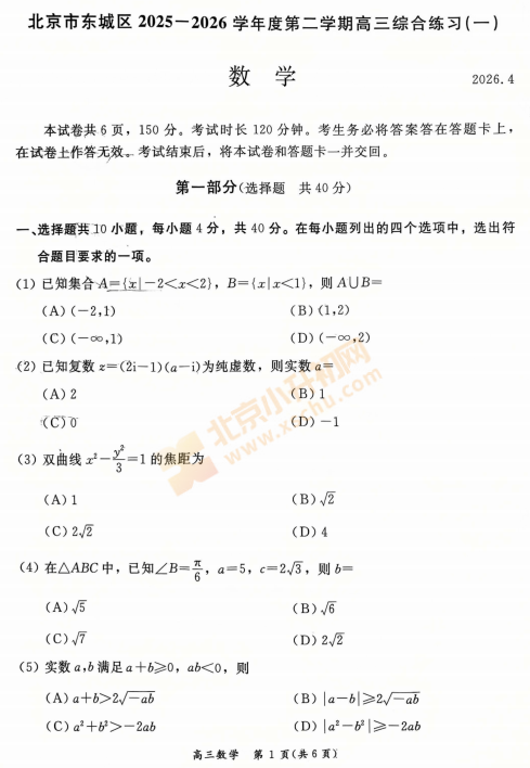 2026东城高三一模数学试卷已出!考哪些内容?满分多少?有多少题?2026、2027、2028东城高三考生下载复习!