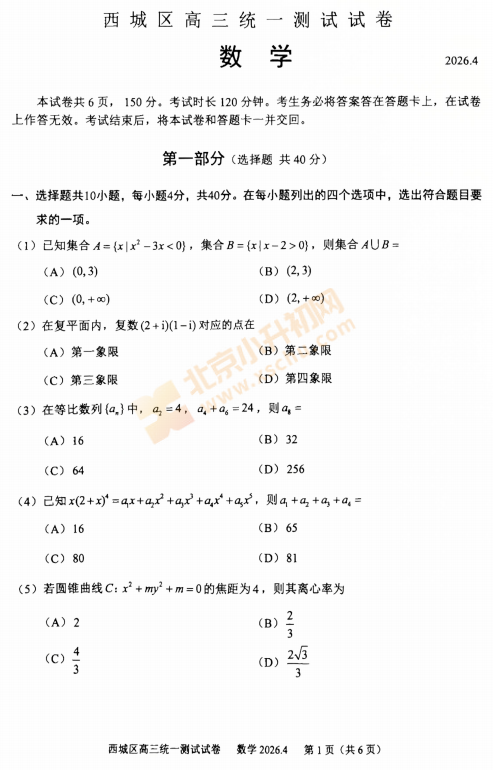 2026西城高三一模数学试卷已出!考哪些内容?满分多少?有多少题?2026、2027、2028西城高三考生下载复习!