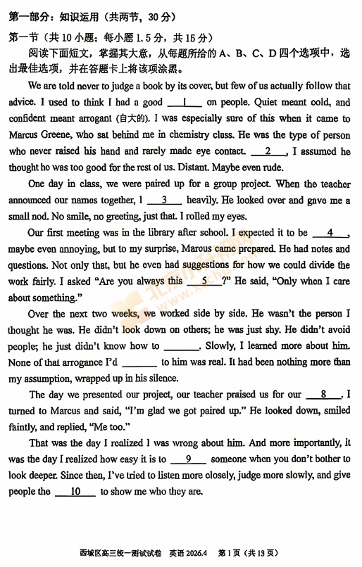 2026西城高三一模英语试卷已出!考哪些内容?满分多少?有多少题?2026、2027、2028西城高三考生下载复习!