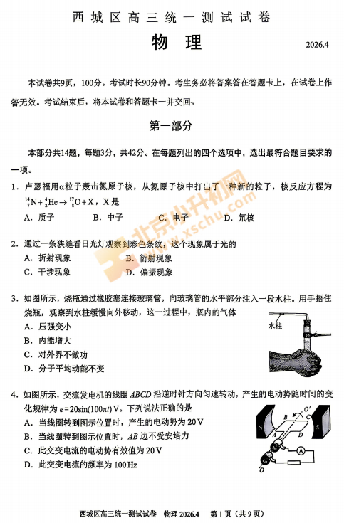2026西城高三一模物理试卷已出!考哪些内容?满分多少?有多少题?2026、2027、2028西城高三考生下载复习!