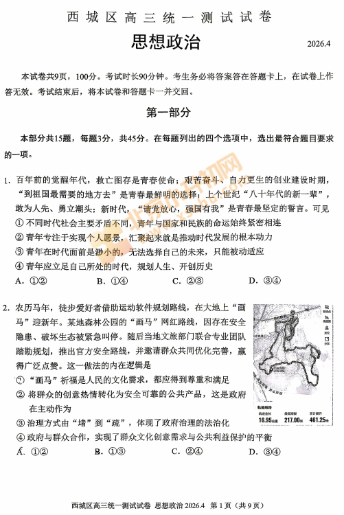 2026西城高三一模政治试卷已出!考哪些内容?满分多少?有多少题?2026、2027、2028西城高三考生下载复习!