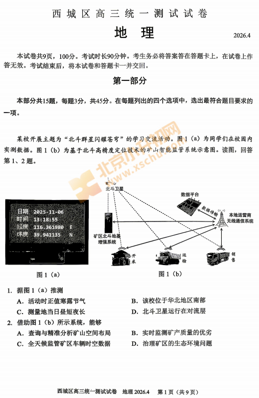 2026西城高三一模地理试卷已出!考哪些内容?满分多少?有多少题?2026、2027、2028西城高三考生下载复习!