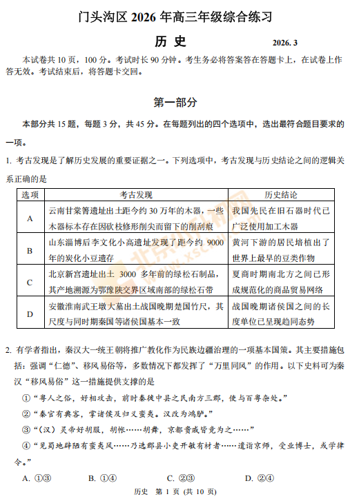2026门头沟高三一模历史试卷已出!考哪些内容?满分多少?有多少题?2026、2027、2028门头沟高三考生下载复习!