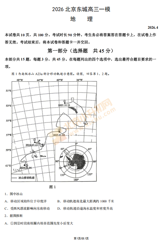 2026东城高三一模地理试卷已出!考哪些内容?满分多少?有多少题?2026、2027、2028东城高三考生下载复习!