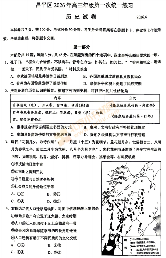 2026昌平高三一模历史试卷已出!考哪些内容?满分多少?有多少题?2026、2027、2028昌平高三考生下载复习!