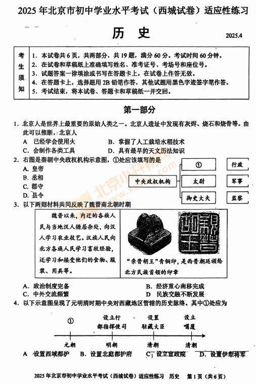 2026年西城初三一模历史试卷什么时候出?考哪些内容?满分多少?有多少题?2026、2027、2028西城初三考生下载复习!