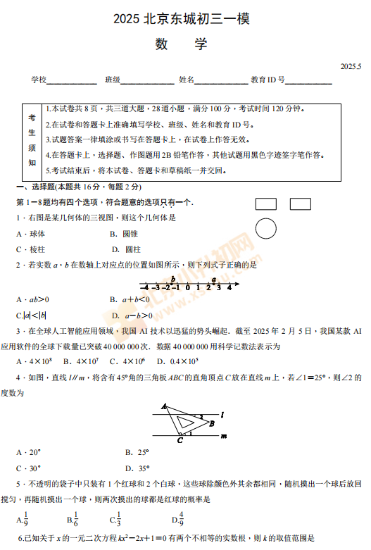 2026年东城初三一模数学试卷什么时候出?考哪些内容?满分多少?有多少题?2026、2027、2028东城初三考生下载复习!
