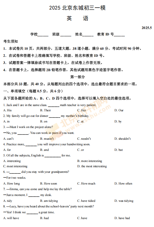 2026东城初三一模考试预计在4月中下旬进行,北京各区初三考生可下载2025年东城初三一模英语试卷复习,2026最新试卷发布后将更新在本页面,建议收藏!