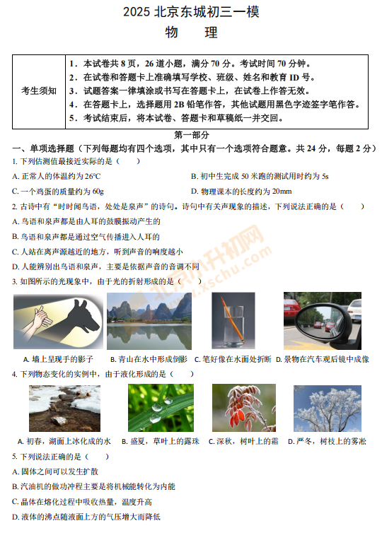2026年东城初三一模物理试卷什么时候出?考哪些内容?满分多少?有多少题?2026、2027、2028东城初三考生下载复习!