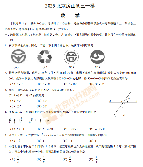 2026年房山初三一模数学试卷什么时候出?考哪些内容?满分多少?有多少题?2026、2027、2028房山初三考生下载复习!