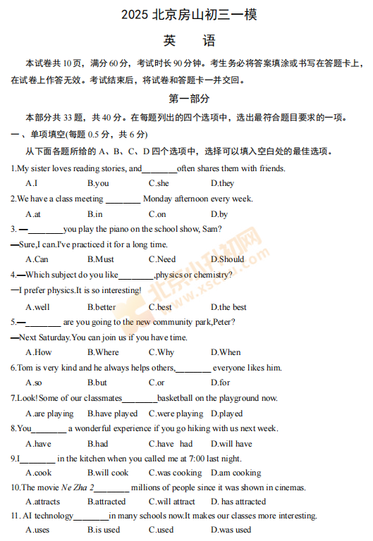 2025北京房山初三一模英语 有答案