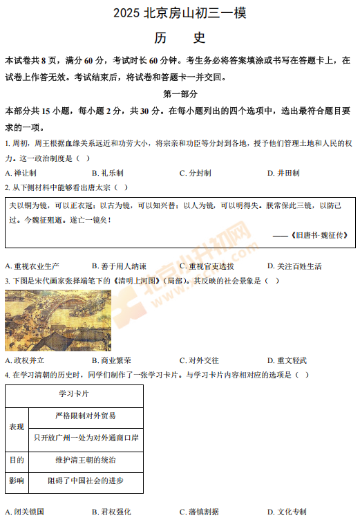 2026年房山初三一模历史试卷什么时候出?考哪些内容?满分多少?有多少题?2026、2027、2028房山初三考生下载复习!