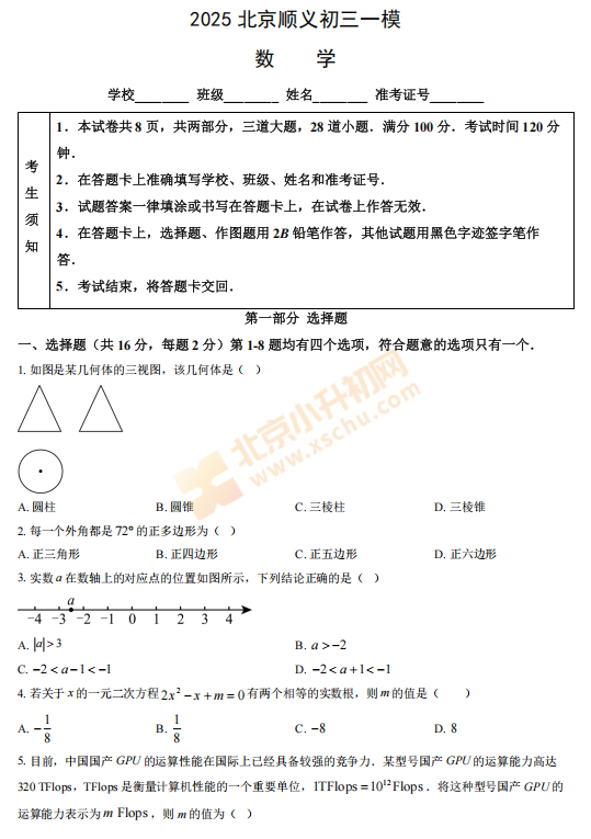 2026年顺义初三一模数学试卷什么时候出?考哪些内容?满分多少?有多少题?2026、2027、2028顺义初三考生下载复习!