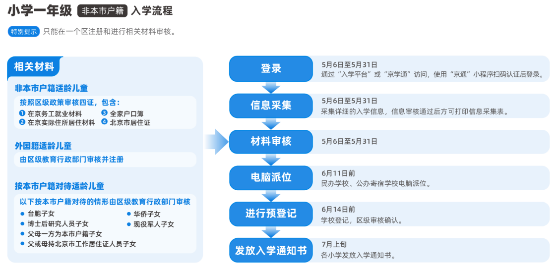 2026北京非京籍幼升小入学流程包含:四证材料审核,信息采集、电脑派位、预登记等。
