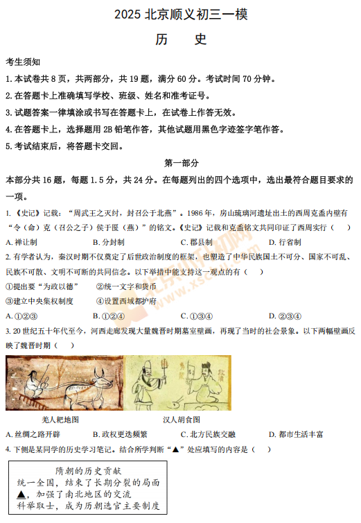 2025北京顺义初三一模历史 有答案