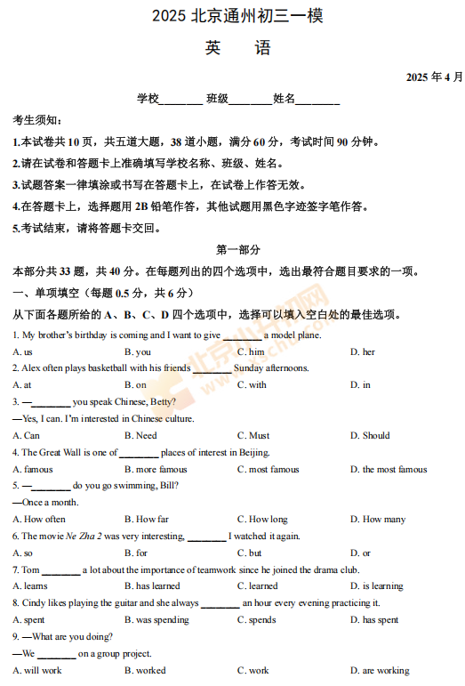 2026通州初三一模考试预计在4月中下旬进行,北京各区初三考生可下载2025年通州初三一模英语试卷复习,2026最新试卷发布后将更新在本页面,建议收藏!