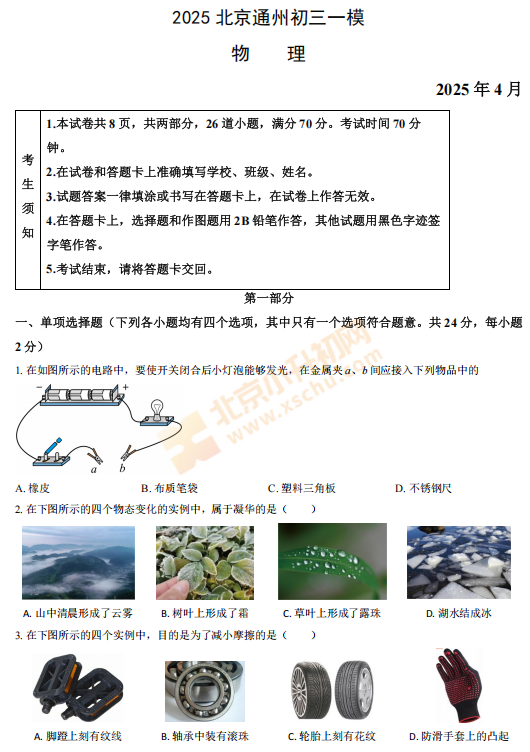 2026年通州初三一模物理试卷什么时候出?考哪些内容?满分多少?有多少题?2026、2027、2028通州初三考生下载复习!