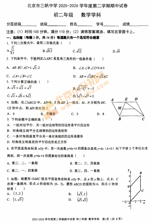 2025-2026学年(下)北京三帆中学初二期中数学试卷下载!考试分值、题型有哪些?