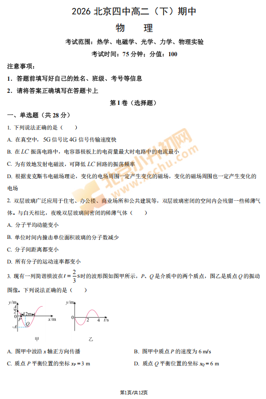 2025-2026学年(下)北京四中高二期中物理试卷下载!考试分值、题型有哪些?