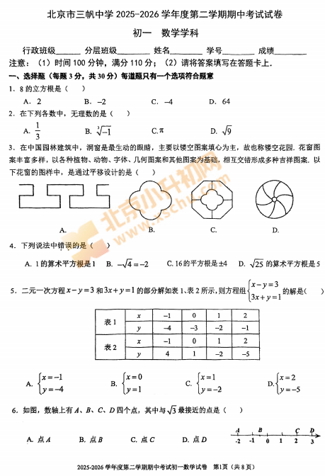 2025-2026学年(下)北京三帆中学初一期中数学试卷下载!考试分值、题型有哪些?