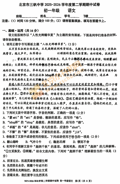 2025-2026学年(下)北京三帆中学初一期中语文试卷下载!考试分值、题型有哪些?