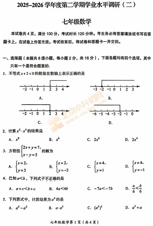 2025-2026学年(下)房山初一期中数学试卷下载!考试分值、题型有哪些?