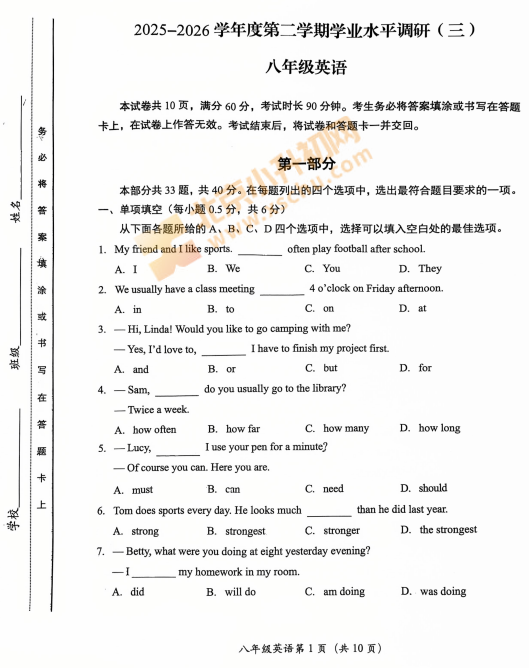 2025-2026学年第二学期房山初二期中英语试卷