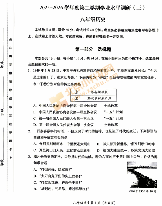 2025-2026学年(下)房山初二期中历史试卷下载!考试分值、题型有哪些?