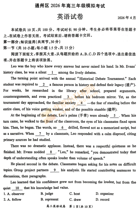 2026通州高三一模英语试卷已出!考哪些内容?满分多少?有多少题?2026、2027、2028通州高三考生下载复习!