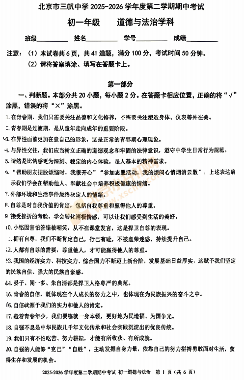 2025-2026学年(下)北京三帆中学初一期中道德与法治试卷下载!考试分值、题型有哪些?