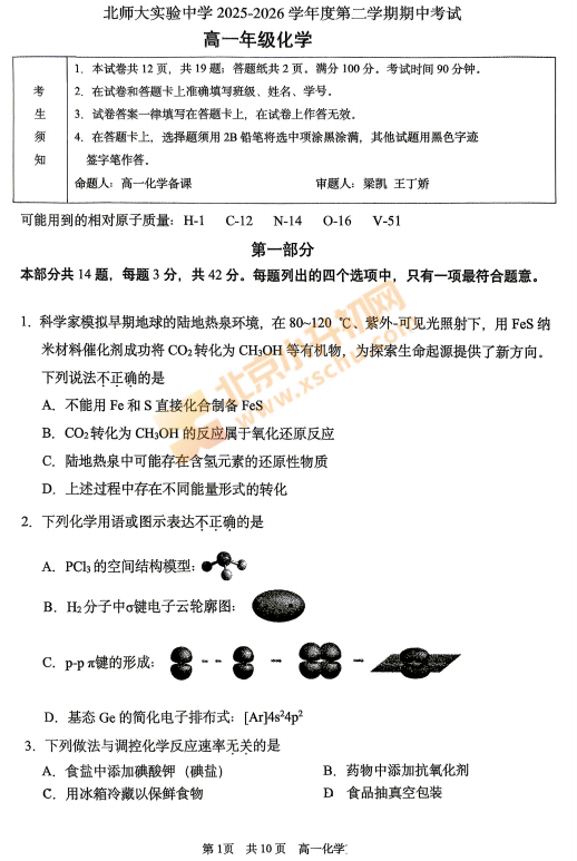 2025-2026学年(下)北师大实验中学高一期中化学试卷下载!考试分值、题型有哪些?