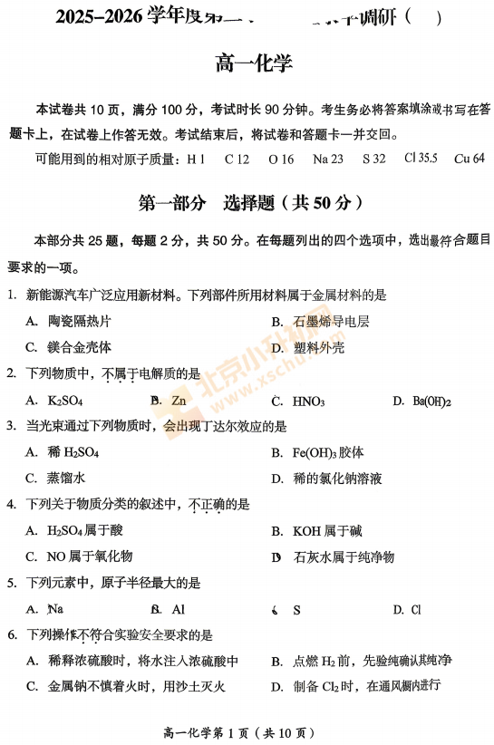 2026房山高一期中试卷房山高一期中化学试卷