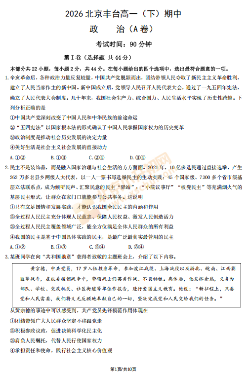 2025-2026学年第二学期丰台高一期中政治试卷(A卷)