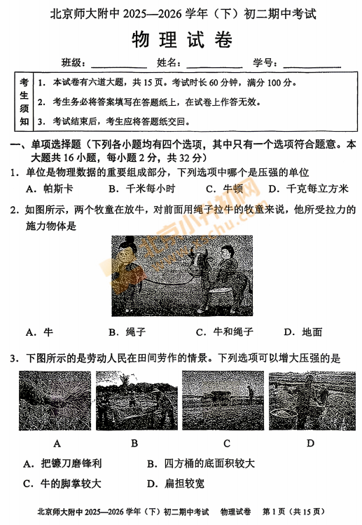 2025-2026学年(下)北京师大附中初二期中物理试卷下载!考试分值、题型有哪些?