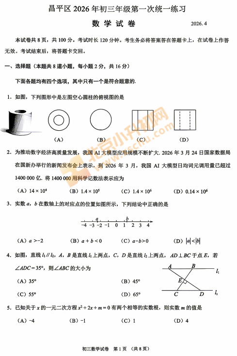 2026年昌平初三一模数学试卷什么时候出?考哪些内容?满分多少?有多少题?2026、2027、2028昌平初三考生下载复习!
