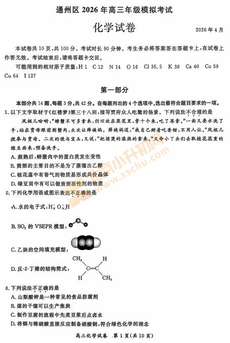 2026通州高三一模化学试卷已出!考哪些内容?满分多少?有多少题?2026、2027、2028通州高三考生下载复习!