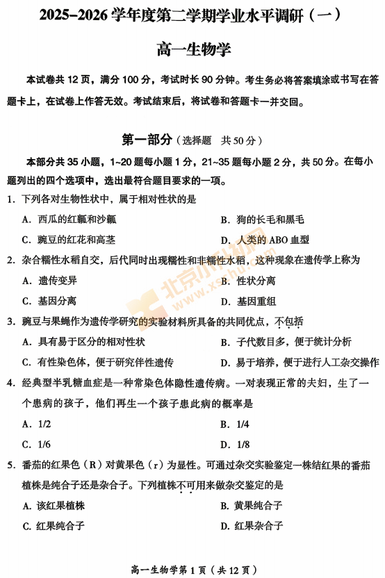 2025-2026学年(下)房山高一期中生物试卷下载!考试分值、题型有哪些?