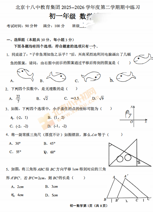 2025-2026学年(下)北京十八中初一期中数学试卷下载!考试分值、题型有哪些?