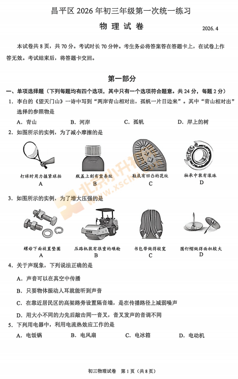 2026年昌平初三一模物理试卷什么时候出?考哪些内容?满分多少?有多少题?2026、2027、2028昌平初三考生下载复习!