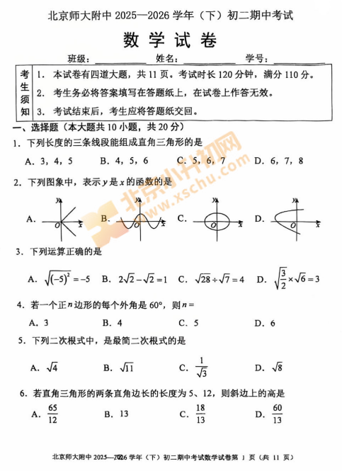 2025-2026学年(下)北京师大附中初二期中数学试卷下载!考试分值、题型有哪些?