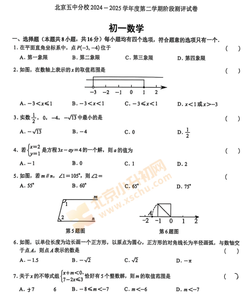 2025-2026学年(下)北京五中分校初一期中数学试卷下载!考试分值、题型有哪些?