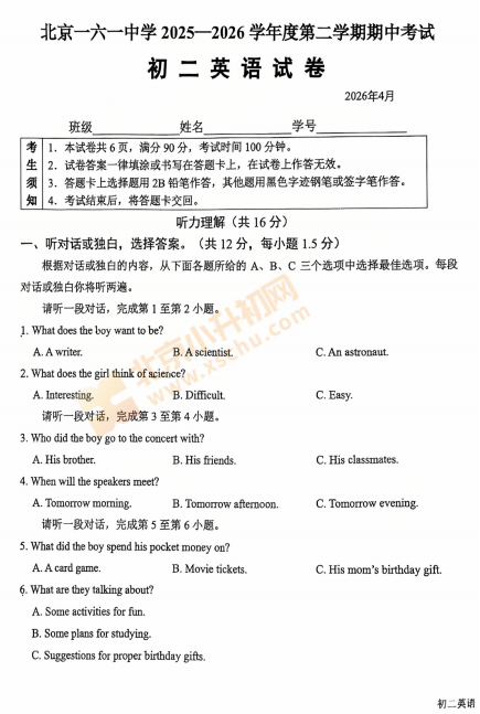2025-2026学年(下)北京一六一中学初二期中英语试卷下载!考试分值、题型有哪些?